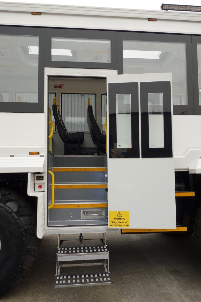 The high ground clearance for rough terrain coupled with the wider axles makes this vehicle well suited to the (as in this case) the construction of a bespoke body to accommodate up to 66 passengers in air conditioned comfort.