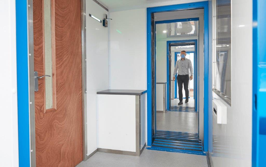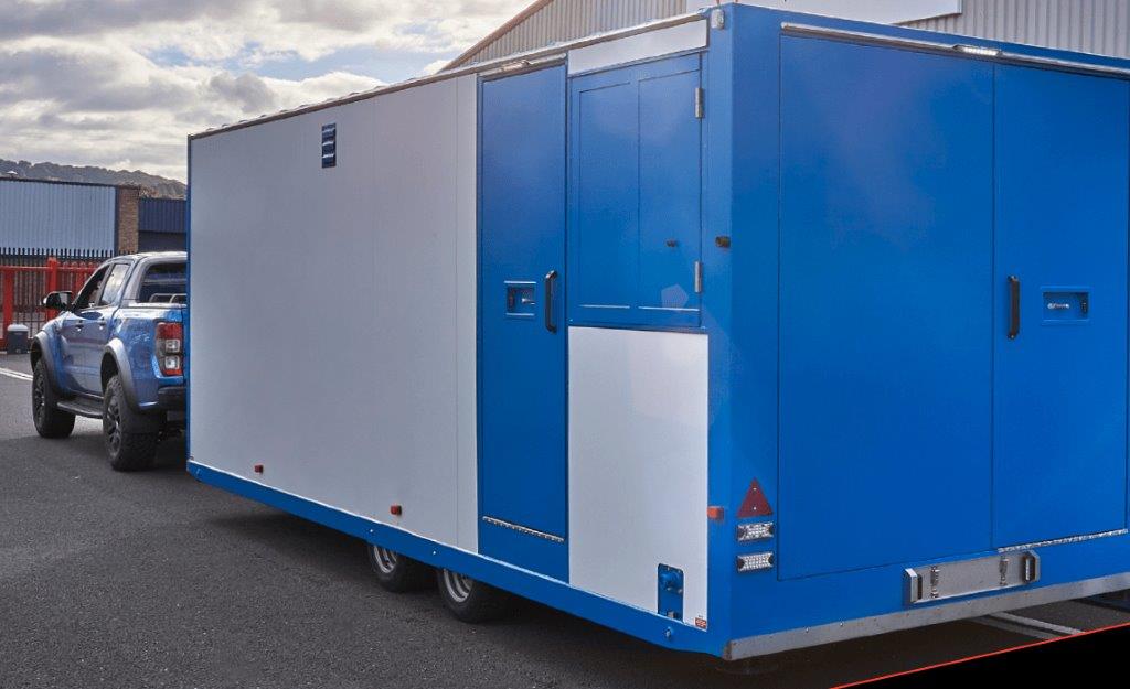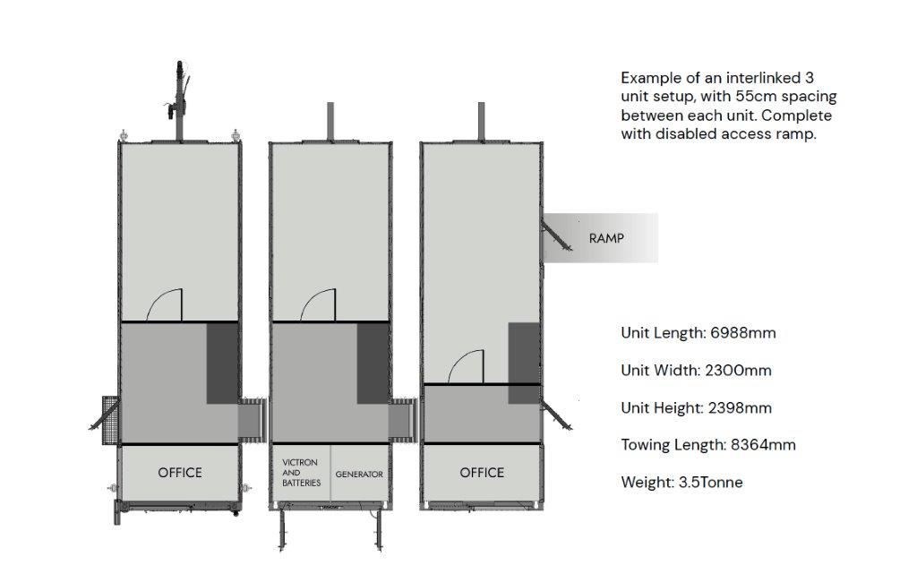 Built on tandem axle fast two trailers the units are incredibly easy to manoeuvre and deploy. The interlinking doors gives a good separation between office space and treatment rooms where necessary.