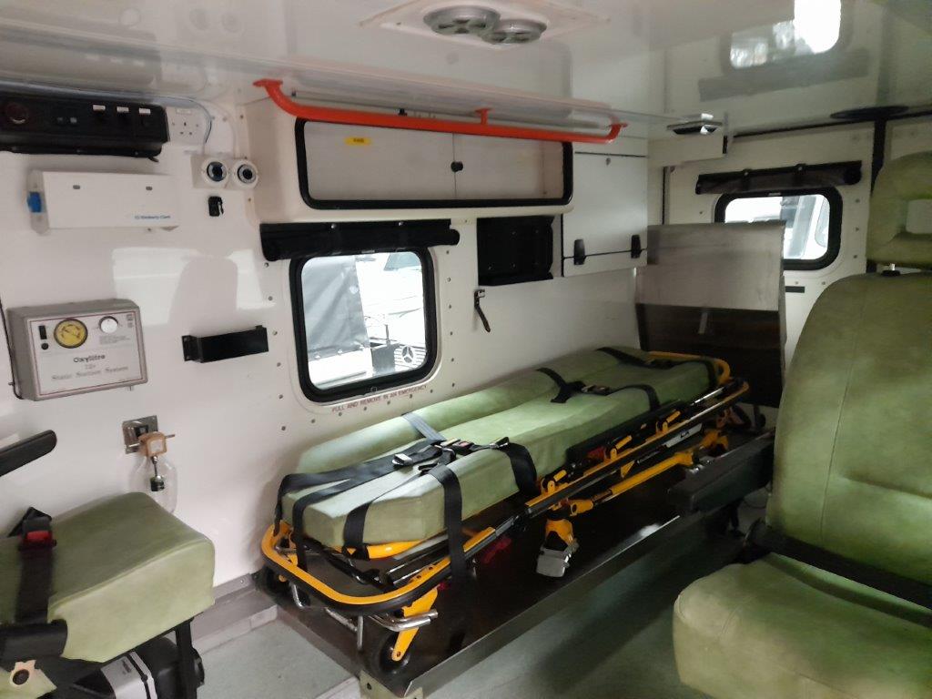 The ambulance body compartment is at the rear and is set out for a single stretcher and up to three attending medics with plenty of storage space as well as being piped for oxygen supply