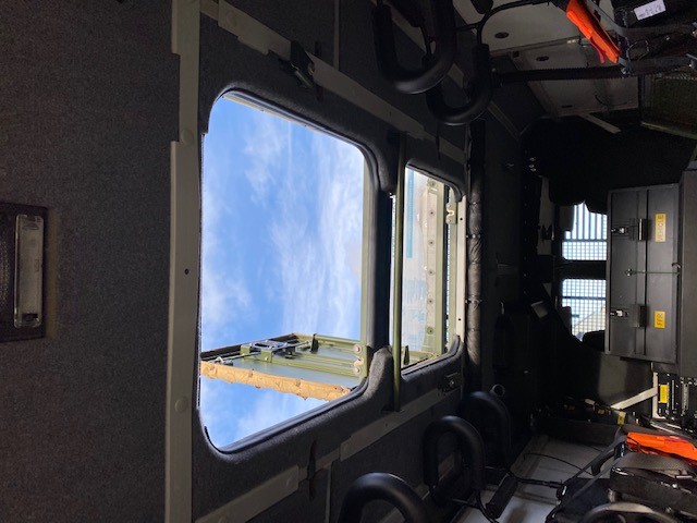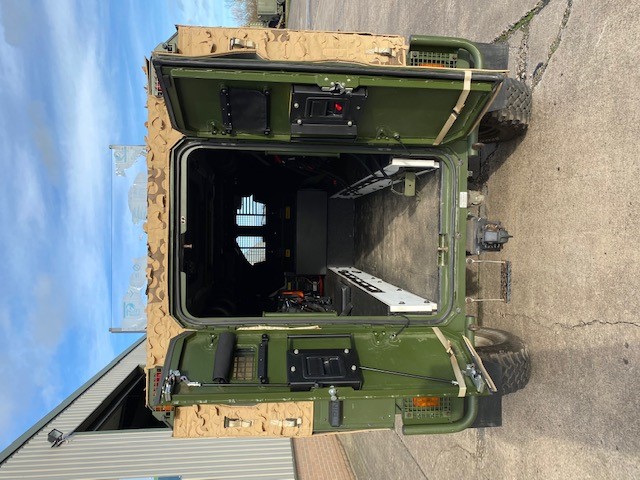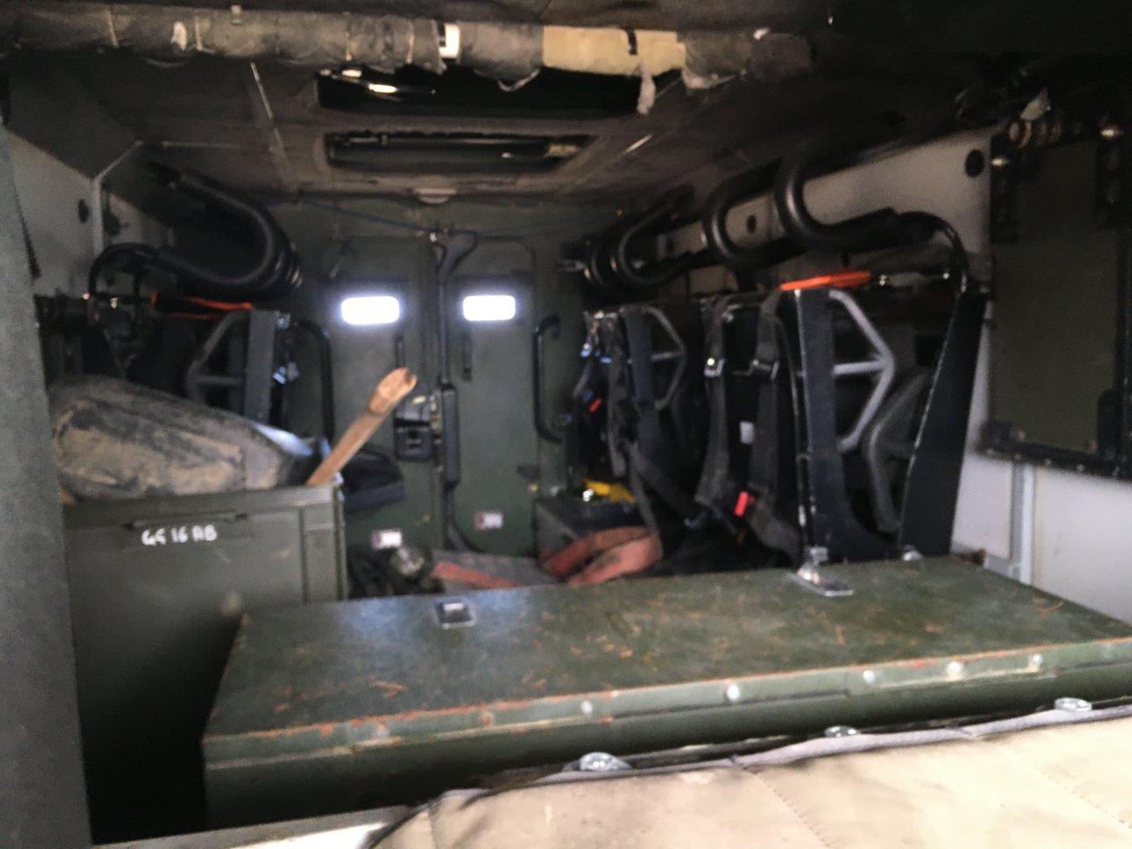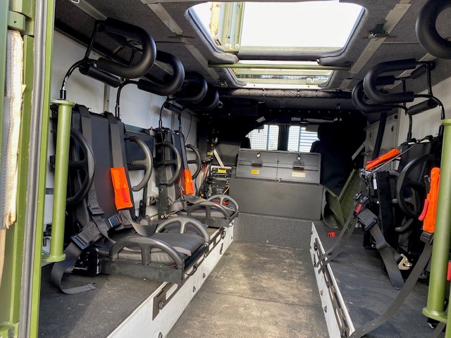 The troop compartment is at the rear and normally consists of four people who can rapidly enter and leave the vehicle via two doors in the rear of the vehicle. The seats are fitted with 4 point harness seat belts. Additional seating in the rear could be fitted if required