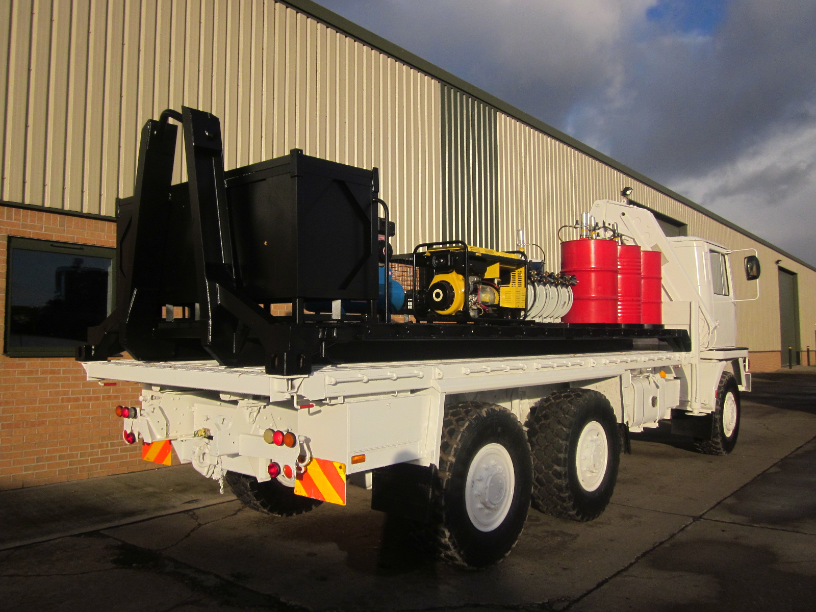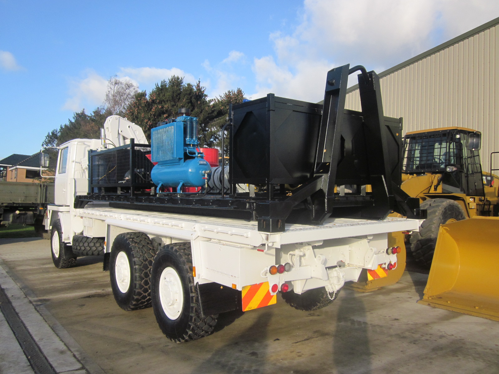 Bedford TM 6x6 service truck with de mountable body with twist locks and hydraulic 3500 Kg atlas crane.