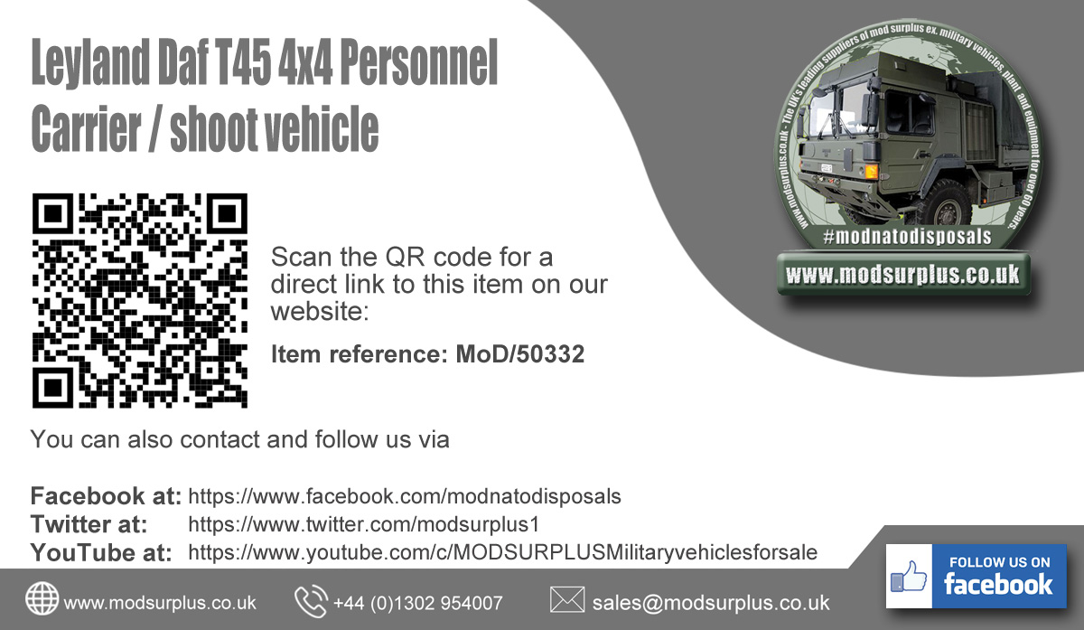 Leyland Daf T45 4x4 Personnel Carrier / shoot vehicle with Canopy & Seats - MoD Ref: 50332