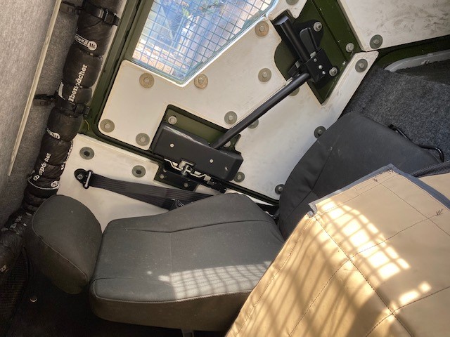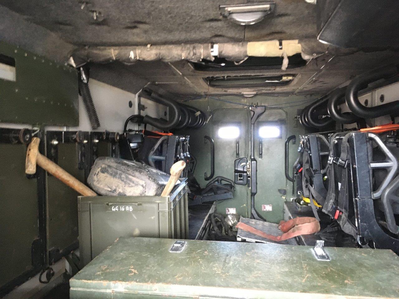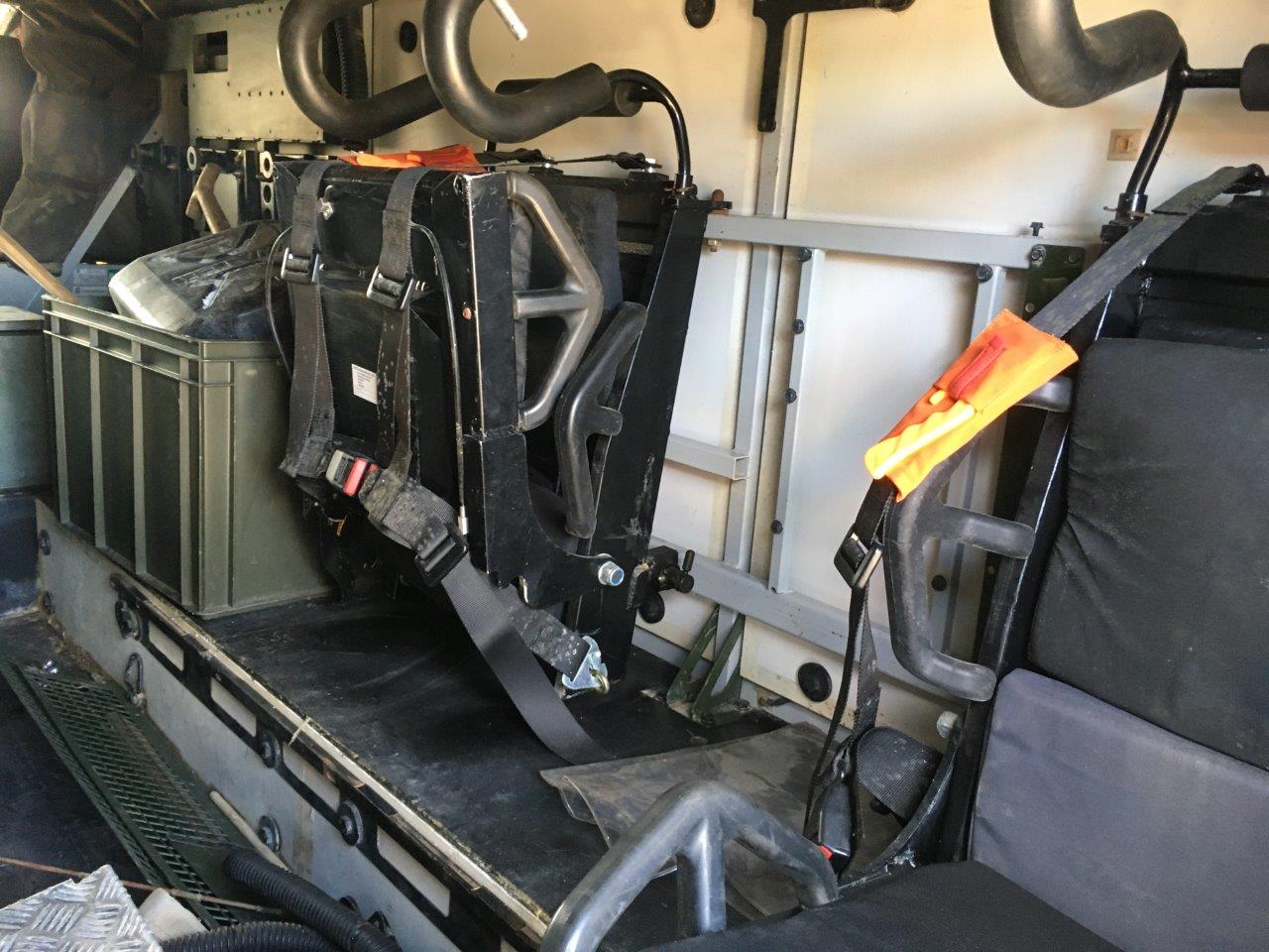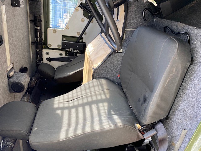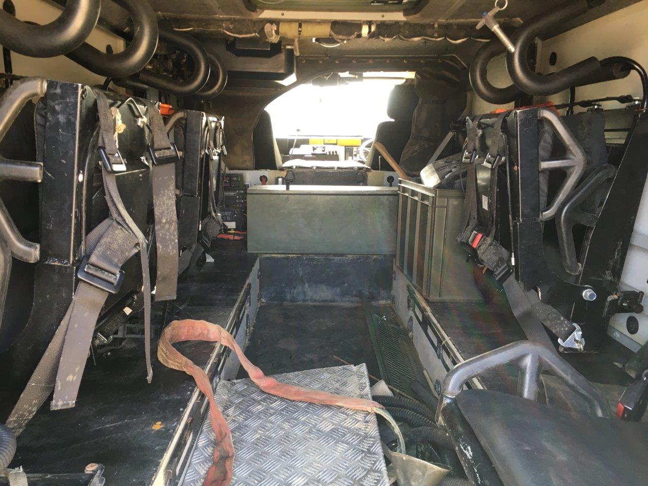 The troop compartment is at the rear and normally consists of four people who can rapidly enter and leave the vehicle via two doors in the rear of the vehicle. The seats are fitted with 4 point harness seat belts. Additional seating in the rear could be fitted if required