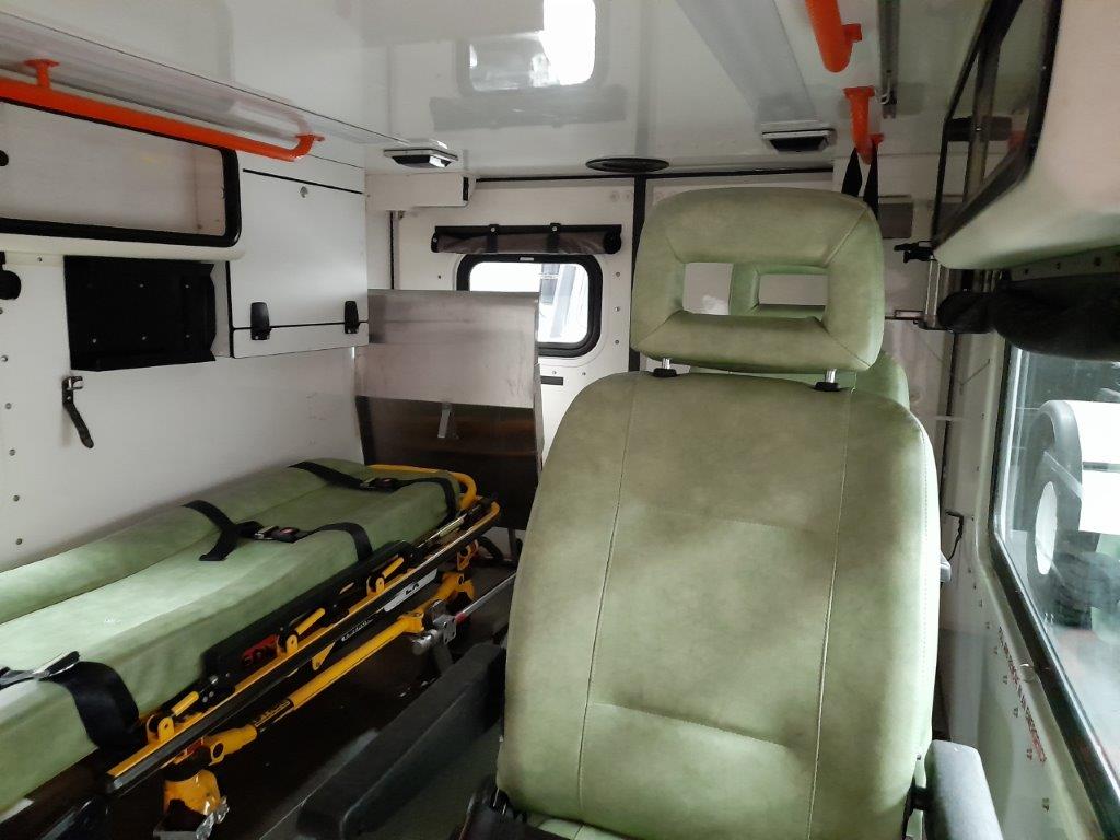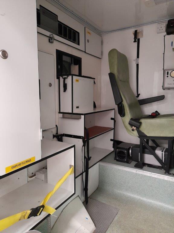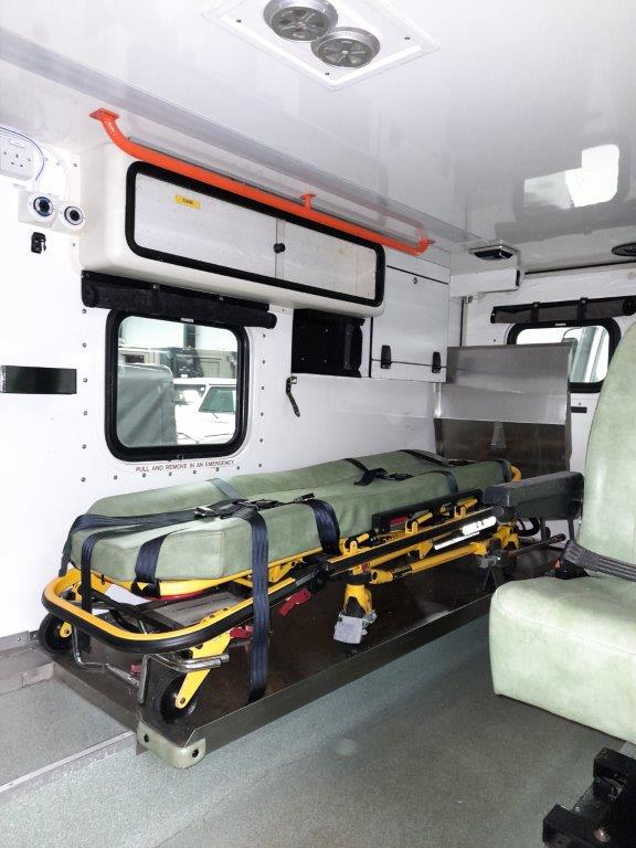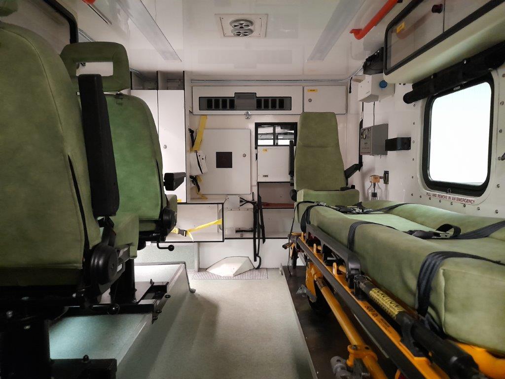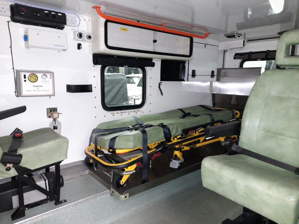 The ambulance body compartment is at the rear and is set out for a single stretcher and up to three attending medics with plenty of storage space as well as being piped for oxygen supply
