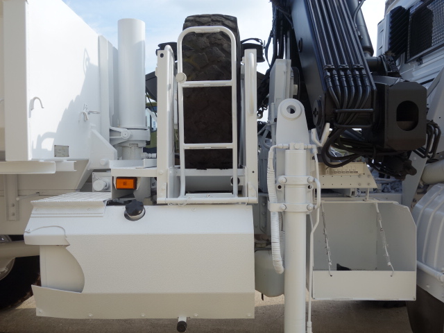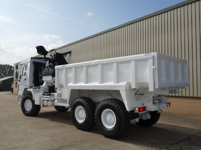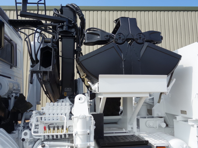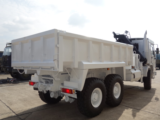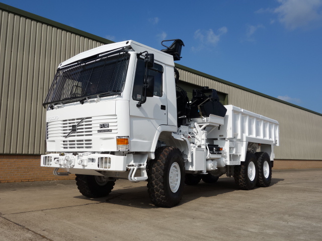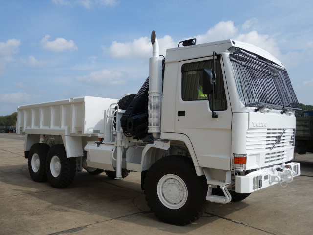 Volvo FL12 RHD 6x6 tipper truck with Hiab crane and clamshell bucket, this truck has been modified to include a protected cab with kevlar protection to driver and passenger and also mesh windscreen.